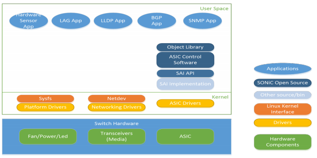 SONIC (Software for Open Networking in the Cloud) 主要是运行在开放交换机上的开源网络操作系统,其包含了一个功能齐全的网络层设备。SONIC是基于Linux的,运行在Debian Jessie上。主要架构包含:硬件配件(Hardware components)、驱动程序(Drivers)、Linux 内核接口、一些源文件、SONIC 开放源、其他应用。其架构如下图:
